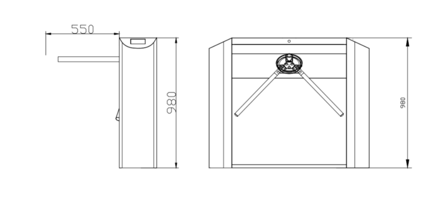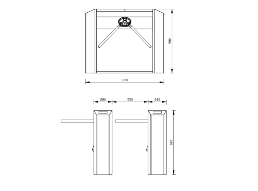 规格参数 n 外壳材料: SUS304#不锈钢 n 外壳加工工艺:采用激光、折弯、切割、焊接、拉丝、抛光、打磨等工艺。 n 规格尺寸:1200*280*980mm n 闸杆长/粗:510(mm)/¢38不锈钢管。 n 闸杆转向:单向、双向 n 标准输入接口:继电器开关信号 n 通行速度:≥30-40人/分钟。 n 适应温度:-40℃ ~ 80℃。(-20℃以下考虑增加温控系统) n 适应湿度:5%— 95% n 工作环境:室内、室外。 产品尺寸